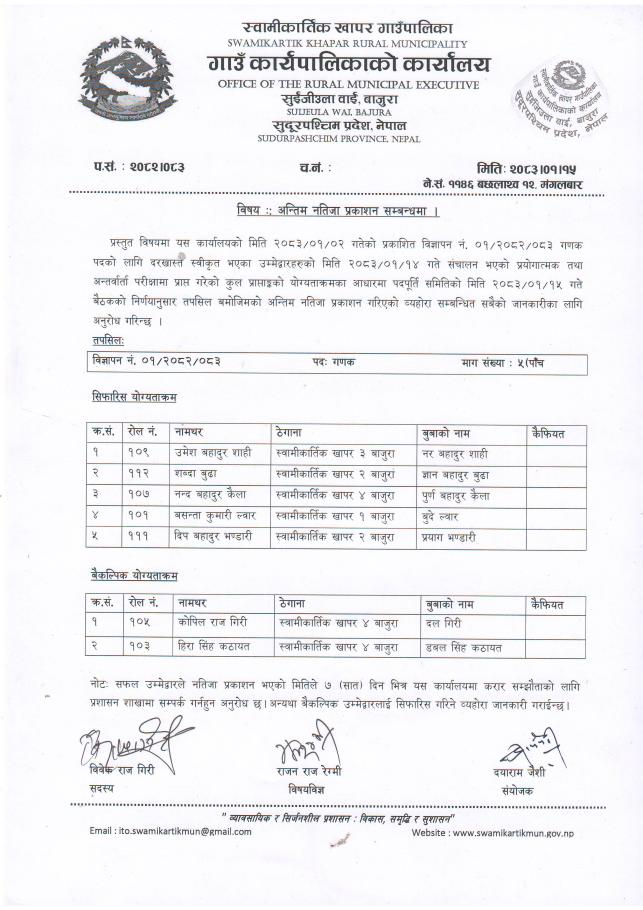 गणक पदको अन्तिम नतिजा प्रकाशन सम्बन्धी सूचना